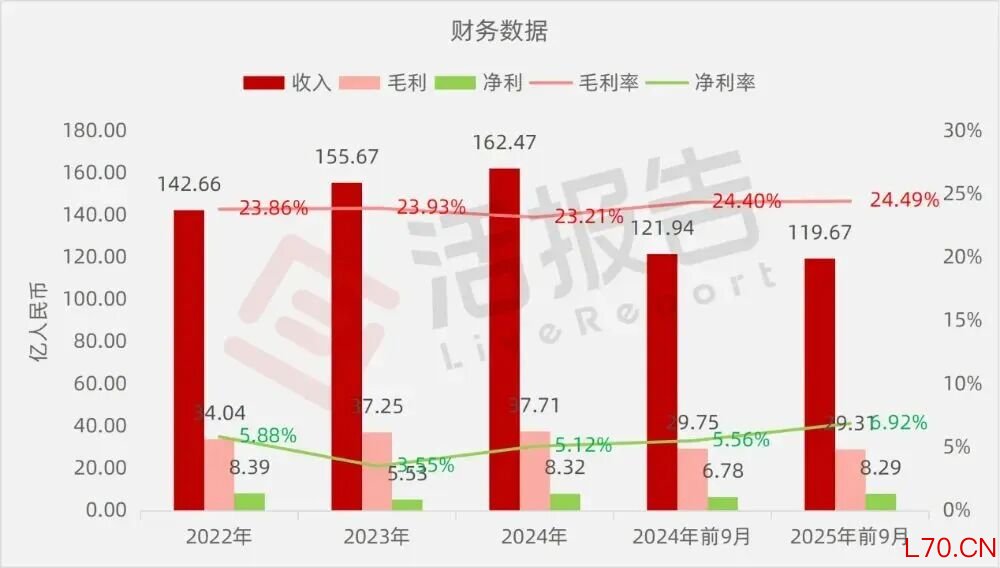 收入分别约为人民币142.66亿、155.67亿、162.47亿、121.94亿、119.67亿,2025年前9月同比-1.86%;