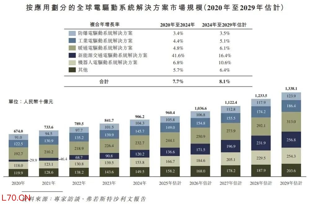 根据弗若斯特沙利文(Frost & Sullivan)报告,全球电驱动系统解决方案市场预计在未来将持续增长,从2020年的人民币6,740亿元增加至2029年的人民币13,381亿元,复合年增长率为7.7%(2020年至2024年)及8.1%(2024年至2029年估计)。