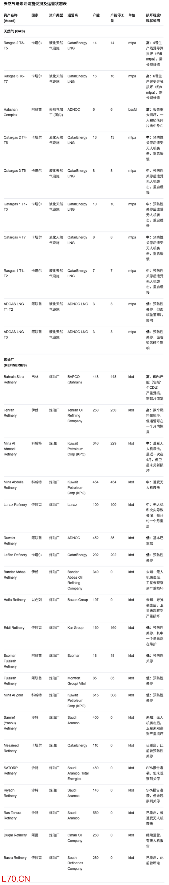 约90万桶/日产能可在数周内恢复,另有80万桶/日需一个月左右;而剩余约70万桶/日的产能(主要集中在巴林Sitra和伊朗德黑兰炼油厂)注定需要更长时间的修复。