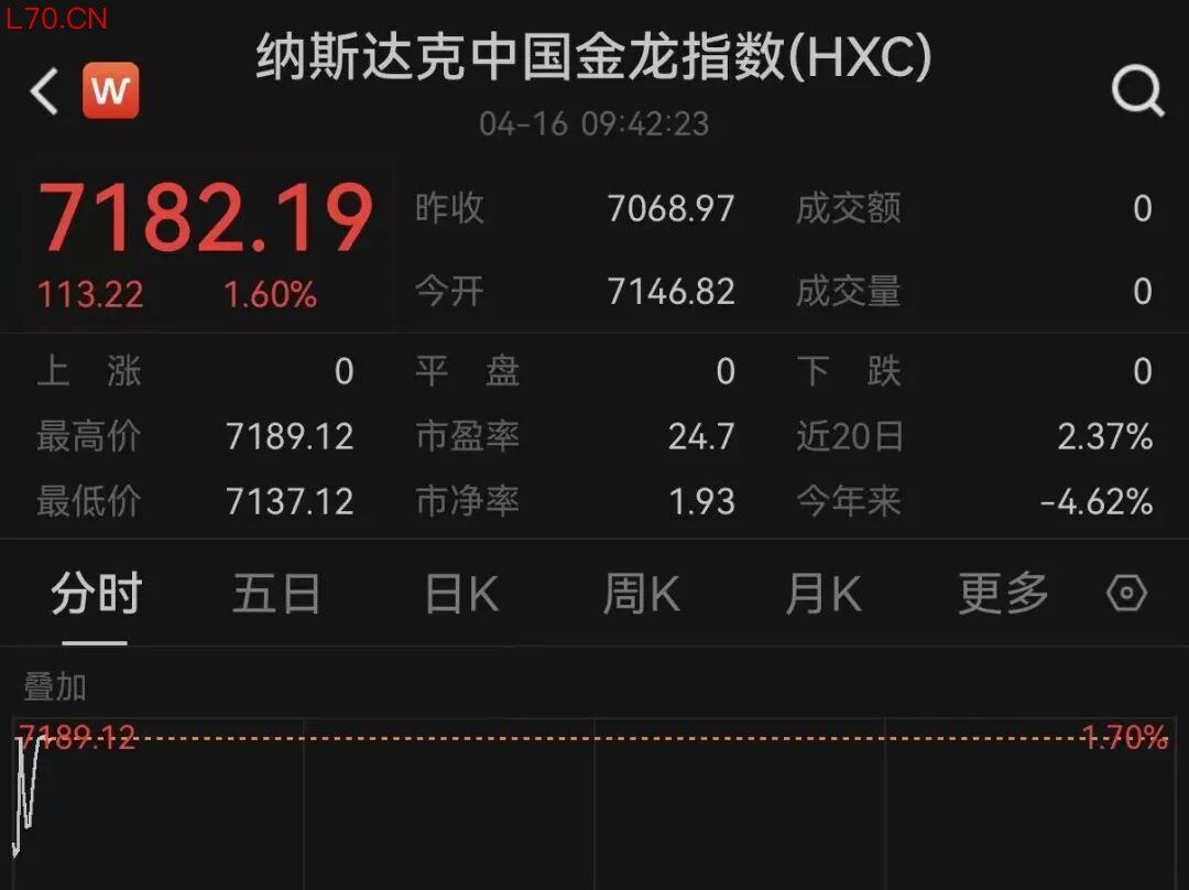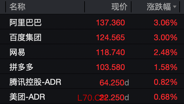 中概股多数上涨。截至发稿,纳斯达克中国金龙指数涨1.6%。中概科技龙头爆发,阿里巴巴、百度集团涨超3%。