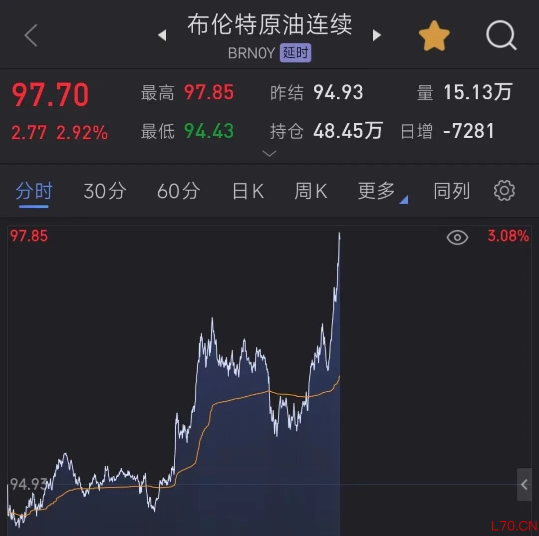 原油直线拉升。截至发稿,布伦特原油涨近3%,报97.7美元/桶。