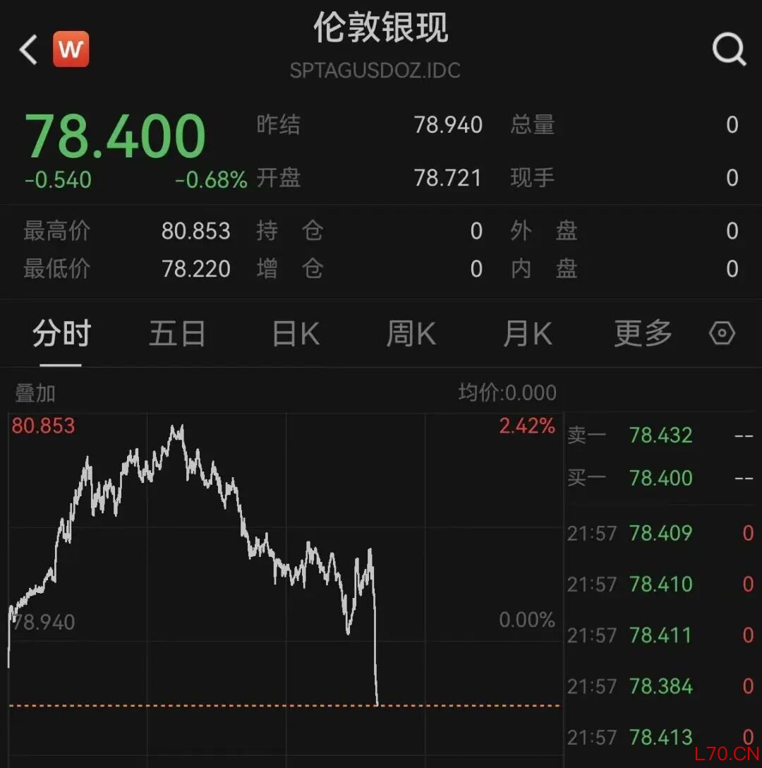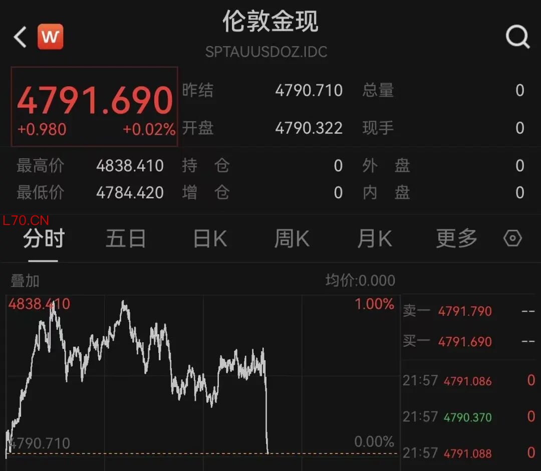 黄金、白银涨幅收窄。截至发稿,现货黄金报4791.69美元/盎司;现货白银报78.4美元/盎司,由涨转跌。