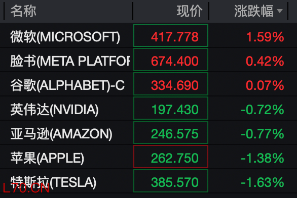 美国科技七巨头涨跌不一。微软涨超1%,苹果、特斯拉则跌超1%。