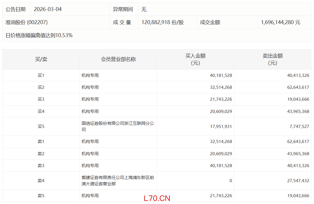 准油股份今日涨停,有3家机构专用席位净卖出5371.75万元