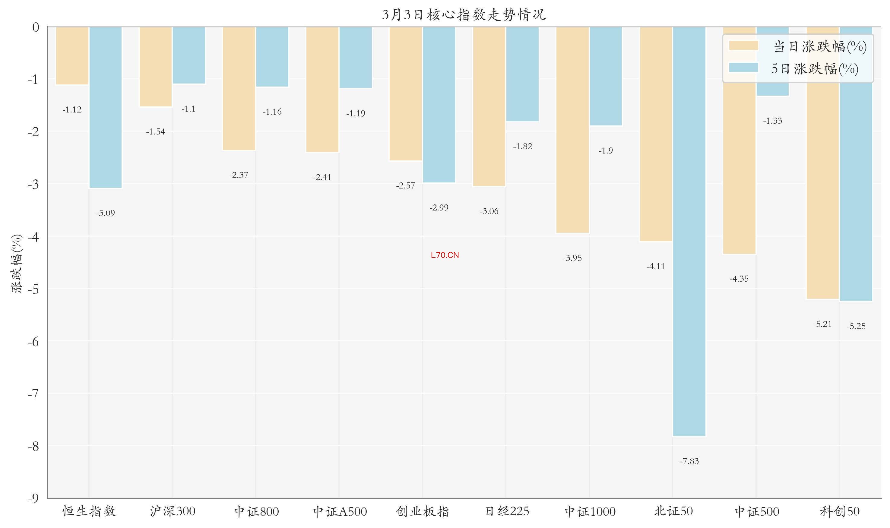 统计A股与海外主要核心指数走势,今日(3月3日,下同)三大指数集体下跌,其中上证指数下跌1.43%,收于4122.68点,日内最高4197.23点;深证成指下跌3.07%,收于14022.39点,日内最高14526.06点;创业板指下跌2.57%,收于3209.48点,日内最高3331.26点。今日恒生指数、沪深300与中证800走势排名靠前,日涨跌幅分别为-1.12%、-1.54%与-2.37%;近5个交易日沪深300、中证800与中证A500的走势排名靠前,近5日涨跌幅分别为-1.1%、-1.16%与-1.19%。