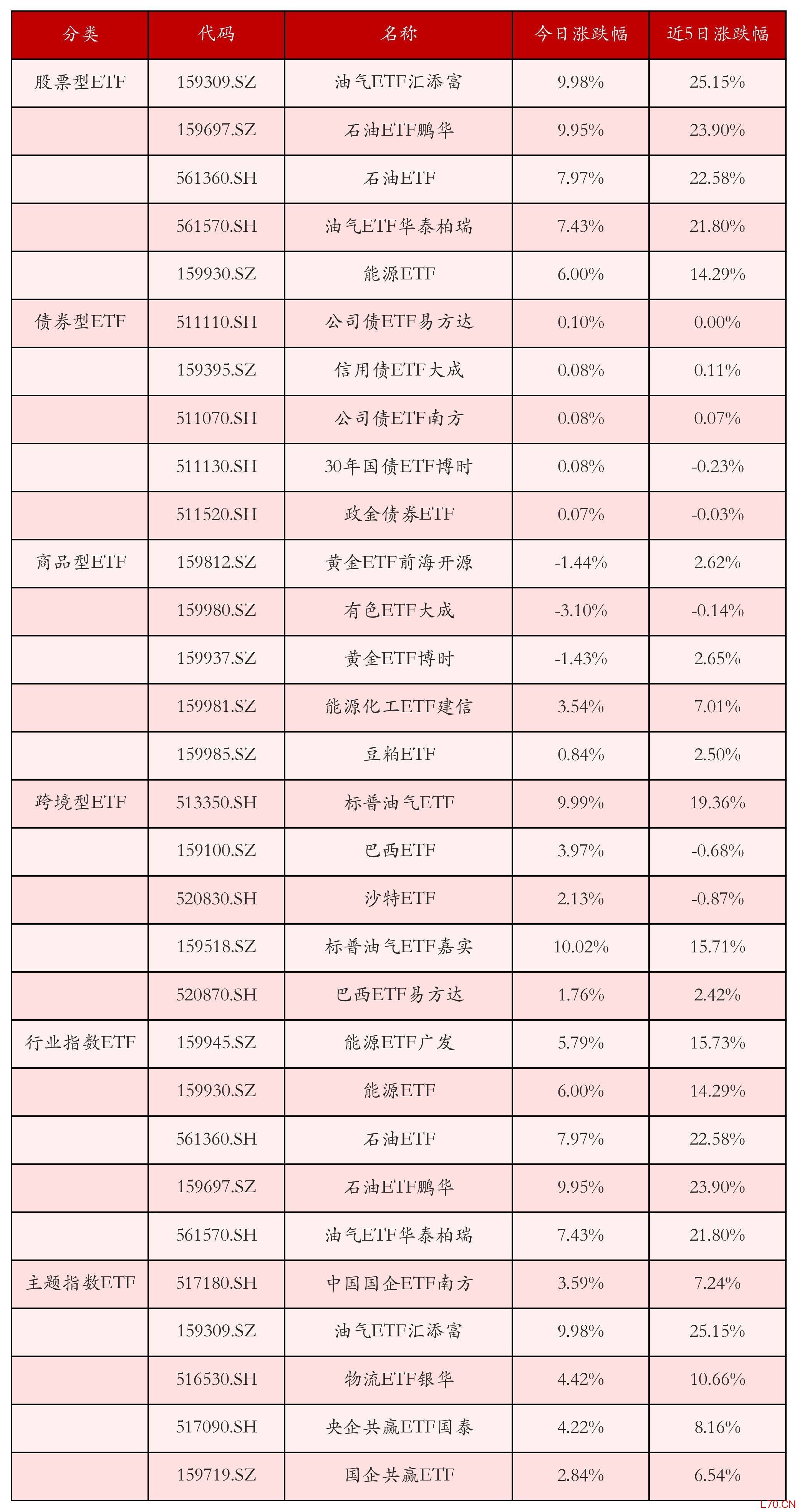 元股证券:ygzq.hk从不同投资种类、行业、主题的ETF产品中找出今日走势行情排名前5的ETF基金,今日涨幅靠前的ETF产品如下表所示。股票型ETF中涨跌幅排名前3位的ETF产品分别为油气ETF汇添富(159309.SZ)、石油ETF鹏华(159697.SZ)和石油ETF(561360.SH),今日收益率分别为9.98%、9.95%和7.97%。