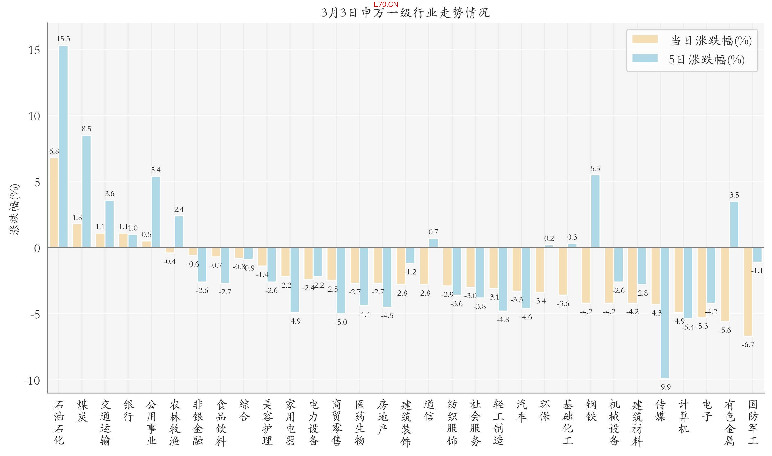 统计今日全部申万一级行业涨跌幅情况,石油石化、煤炭与交通运输今日走势排名靠前,日涨跌幅分别为6.75%、1.76%与1.13%,国防军工、有色金属与电子的走势排名靠后,日涨跌幅分别是-6.74%、-5.61%与-5.3%;近5个交易日石油石化、煤炭与钢铁的走势排名靠前,近5日涨跌幅分别为15.33%、8.48%与5.46%,传媒、计算机与商贸零售的走势排名靠后,近5日涨跌幅分别为-9.91%、-5.39%与-5.03%。