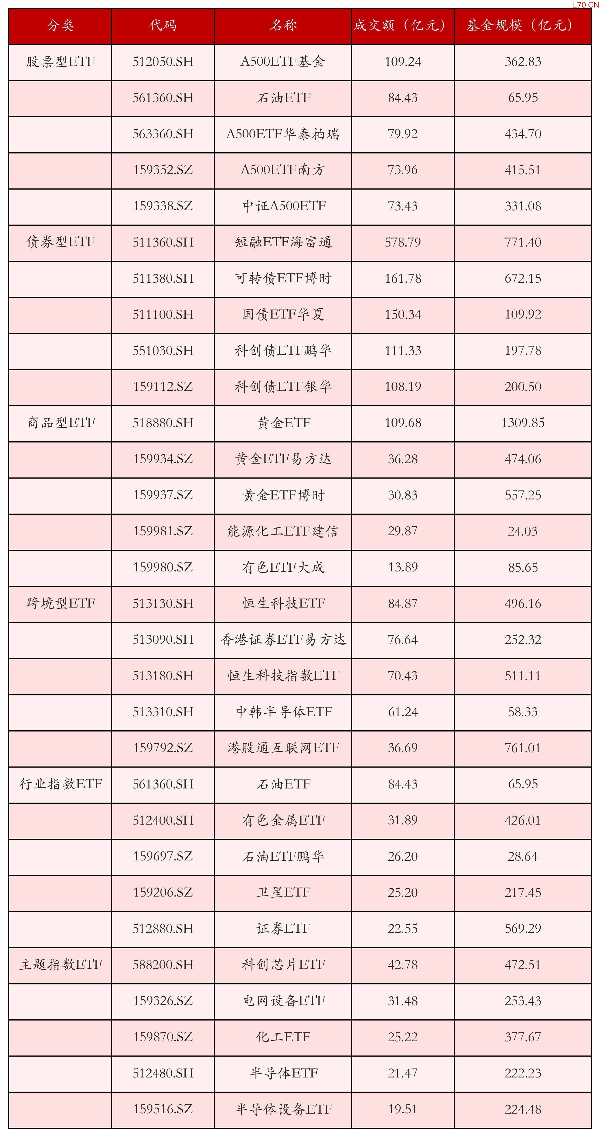 基于成交额对各类ETF今日的成交情况进行统计,成交额靠前的ETF产品如下表所示。股票型ETF中成交额排名前3位的ETF产品分别为A500ETF基金(512050.SH)、石油ETF(561360.SH)和A500ETF华泰柏瑞(563360.SH),今日成交额分别为109.24亿元、84.43亿元和79.92亿元。