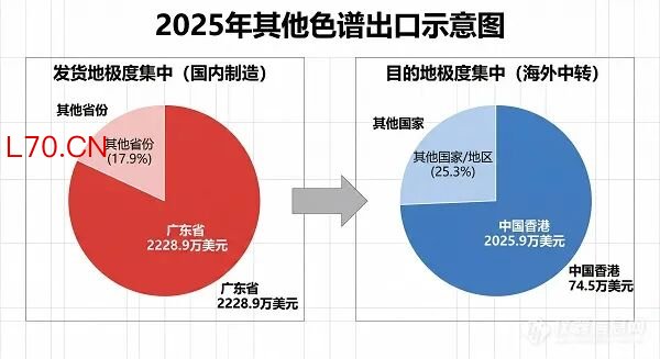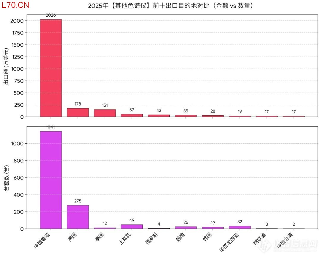 在出口方面,“其他色谱”展现了极其特殊的地域聚集效应。发货地高度集中,广东省以2228 万美元、1377台出口量垄断了全国 80% 以上的出口市场。单一的出口流向,从中国出口的绝大多数其他色谱仪,都流向了中国香港,共计2025 万美元,超过1100台仪器首先落地香港,占比高达75%,是绝对的出口目的地。