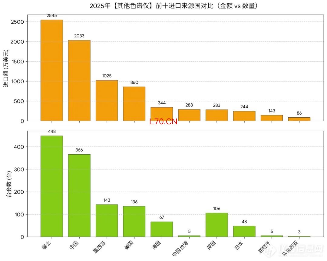 瑞士霸榜的真相:2025年,瑞士以2,545 万美元,448台绝对优势拿下第一大进口来源国,其平均单价高达 5.68 万美元。这一数据背后,主要指向了制药及生命科学领域的“卖水人”——一方面以 Cytiva等为代表的高端蛋白纯化系统及工业级制备色谱供应链主要分布于瑞士周边,另一方面高端薄层色谱的供应商卡玛也位于瑞士。