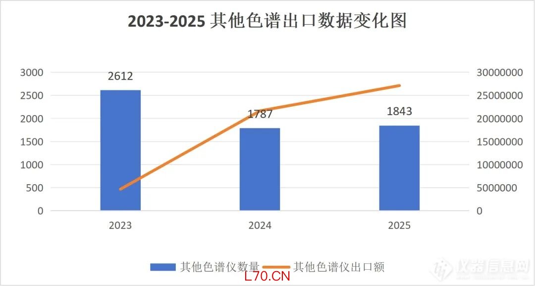 从出口端来看,2025年全年共出口其他色谱仪1843 台,在物理出货量上已实现对进口量的全面反超;出口总额为 2712 万美元,平均单价则稳步跃升至 1.47 万美元/台。
