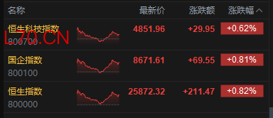 4月14日消息,港股三大指数集体上涨。截至收盘,恒生指数涨0.82%,报25872.32点,恒生科技指数涨0.62%,国企指数涨0.81%。盘面上,科网股涨多跌少,百度、联想涨超3%,京东涨超2%,美团跌超1%;内房股强势,中国金茂涨超7%;电力设备股走弱,协鑫科技跌5%;新消费概念部分走强,泡泡玛特涨超6%。