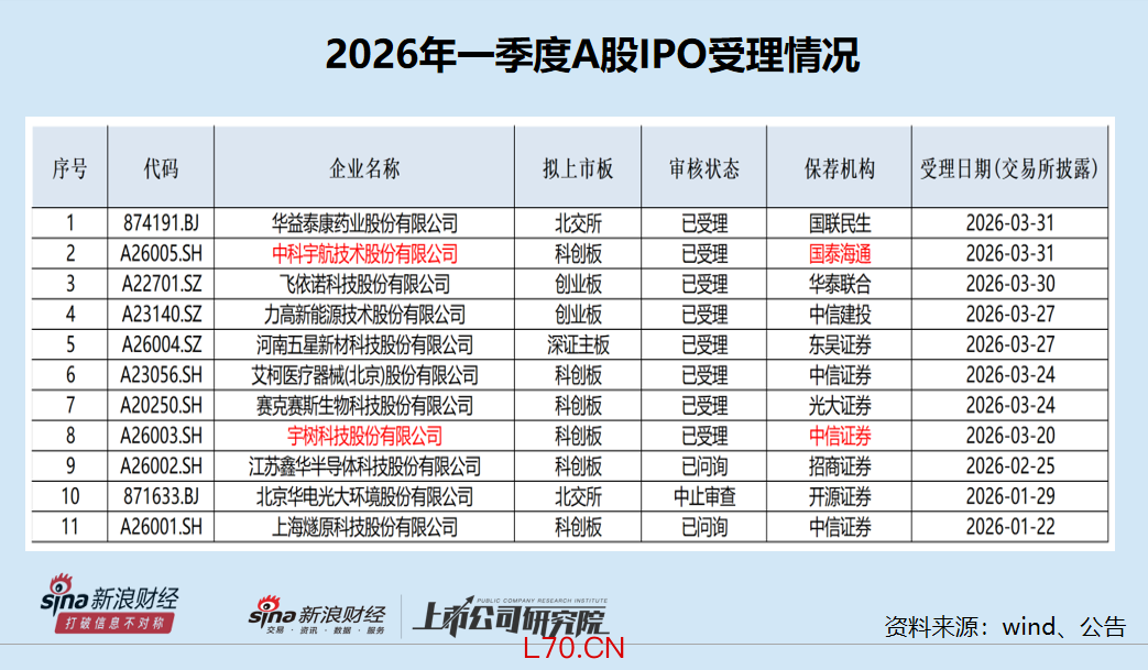 2026年3月,A股IPO市场新受理了8家公司,其中包括知名科技企业中科宇航和宇树科技。今年一季度,合计受理了11家企业。