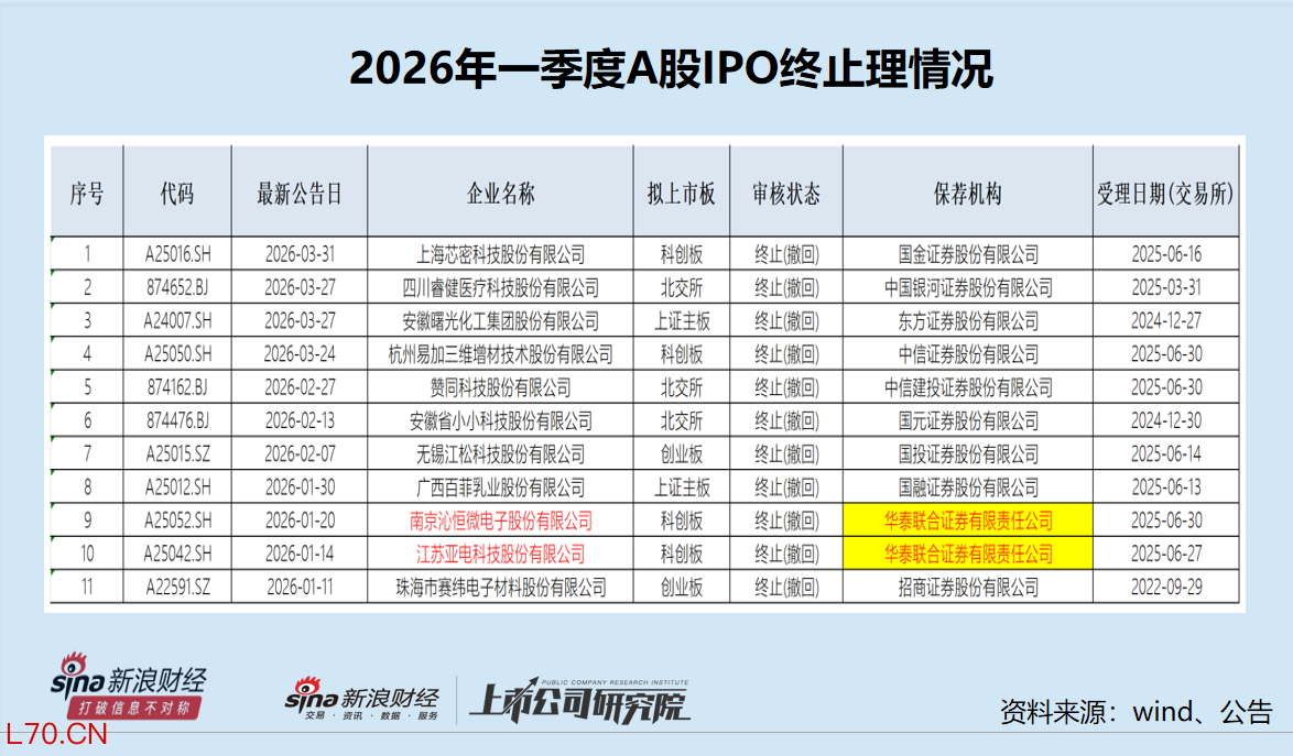 11家终止IPO的企业中,华泰联合保荐的项目数量最高,为2家,其他券商皆为1家。华泰联合保荐的两家企业是南京沁恒微电子股份有限公司(沁恒微)、江苏亚电科技股份有限公司(亚电科技)。