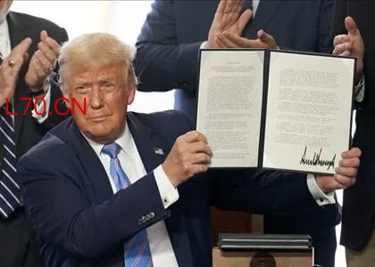 2020年7月29日(星期三),美国总统唐纳德·特朗普在得克萨斯州米德兰市Double Eagle Energy Holdings LLC公司的石油钻井平台上展示其签署的行政令。图片来源:Cooper Neill/Bloomberg via Getty Images