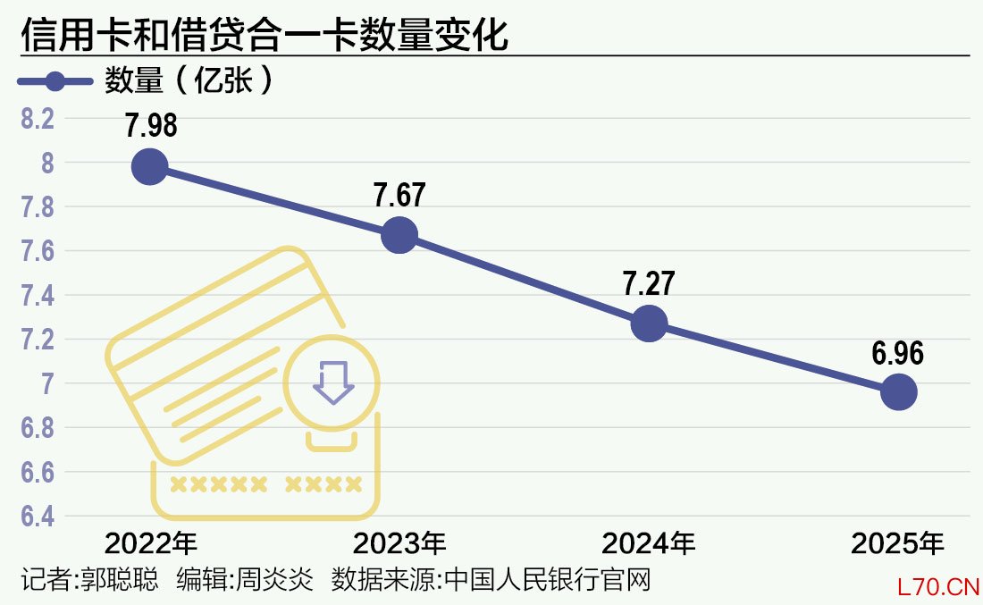 近期,央行发布《2025年支付体系运行总体情况》数据显示,全国信用卡发卡量降至6.96亿张,连续三年下滑,正式跌破7亿关口,创近七年新低水平。