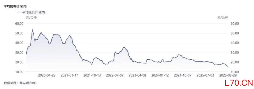 根据同花顺iFinD、农村农业部的数据,截至3月29日,全国猪肉平均批发价为15.27元/公斤,是2010年12月发布数据以来的最低价。