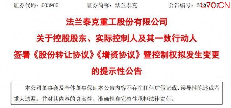 配资炒股3月2日晚间,法兰泰克(603966.SH)发布公告,公司于2026年2月25日收到控股股东、实际控制人金红萍女士、陶峰华先生的通知,其正在筹划公司股份转让事宜,该事项可能导致公司的控制权变更。